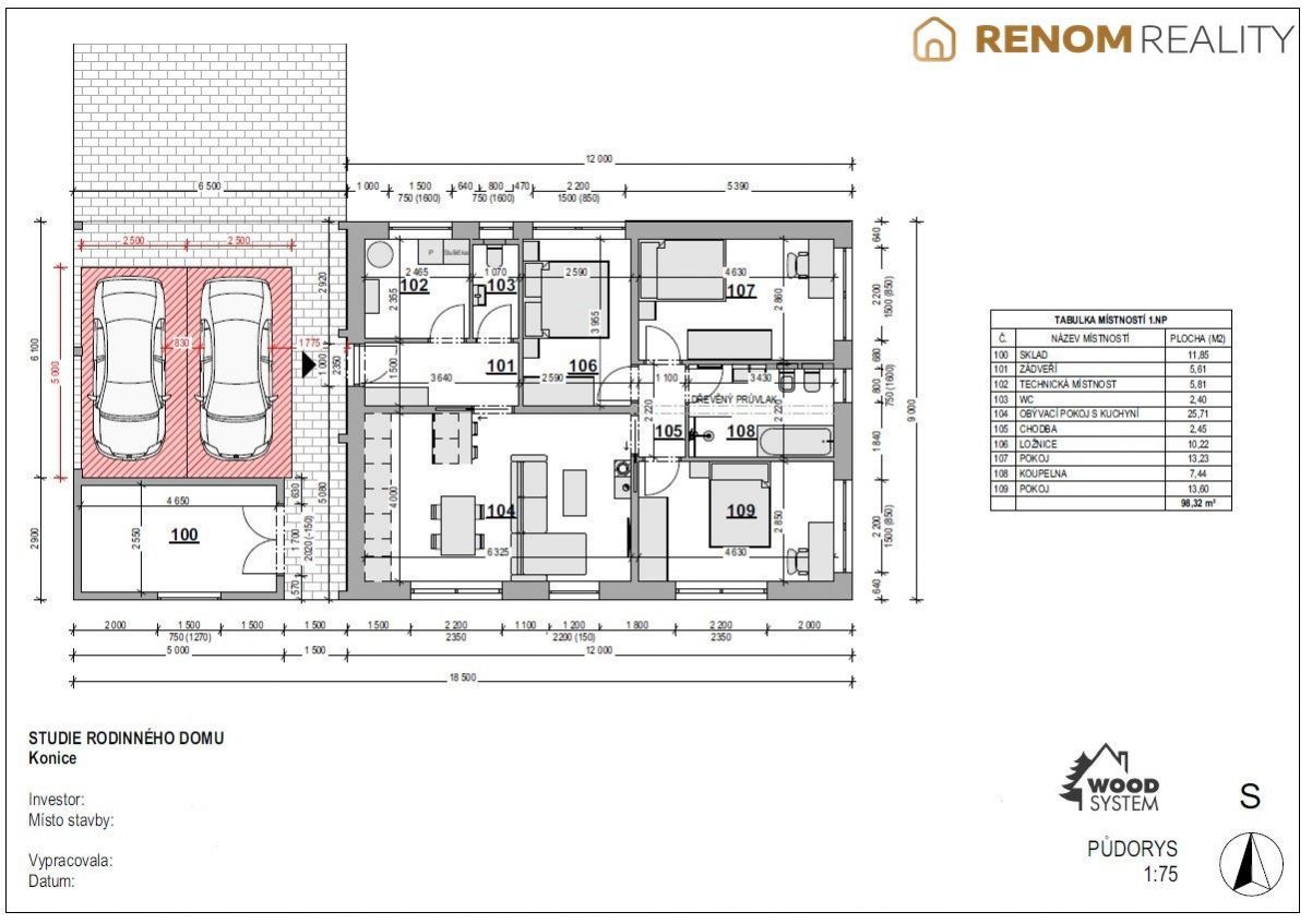 Prodej rodinného domu o dispozici 4+kk se zahradou v obci Konice, ul. Burianova, okr. Prostějov. Jedná se o samostatně stojící dřevostavbu postavenou odbornou a velmi dobře klientsky hodnocenou stavební společností WOOD SYSTEM s.r.o. (vč. záručního servisu 1 rok po dokončení stavby). Nemovitosti stojí na exkluzivním, klidném místě s výhledem na lesy. U domu naprojektováno kryté venkovní stání pro dvě vozidla. Hotová základová deska, vč. příprav, pro zahradní domek/sklad. Provedena příprava na terasu. Rodinný dům se prodává ve fázi kolaudace vč. záruky (bez kuchyňské linky), částečně hotové venkovní zemní úpravy. Osazená kvalitní plastová okna s izolačními 3-skly vč. vstupních dveří od společnosti Rehau, v obývacím pokoji umístěn komín pro krbová kamna, teplovodní podlahové vytápění zajištěno tepelným čerpadlem značky Acond PRO N. Nemovitost je kompletně zateplená zevnitř i z venku (EPS 160 mm), odizolovaná základní deska, natažena venkovní fasáda inovativní systém Baumit Crystal (minerální omítka), střešní betonová taška (Betonpres), umístěna retenční nádoba na dešťovou vodu (kapacita 5 m3), hotová přípojka na fotovoltaické panely, vyvedena elektřina k bráně + vývod el. na terasu pro případný bazén. Dispozice domu: vstupní chodba, technická místnost, samostatné WC s umyvadlem, obývací pokoj s kuchyňským koutem, 3x neprůchozí pokoj, koupelna s vanou a sprchovým koutem, druhé WC. Obývací pokoj s případnou terasou je orientovaný na JIH a nabízí výhled do lesů. Prostorný pozemek téměř čtvercového tvaru o rozměrech cca 31 m x 31m. Celková plocha pozemku činí 936 m2, plocha zahrady činí cca 830m2 (možnost umístit bazén), zastavěná plocha činí 108 m2. Dům se nachází v nově vzniklé klidné čtvrti rodinných domů. Jedná se o nízkoenergetický rodinný dům, s příznivými náklady na provoz. Průkaz energetické náročnosti budovy třída B - Velmi úsporná. Dojezdové vzdálenosti autem: Prostějov cca 23 km (cca 30 min.), Olomouc cca 30km (cca 35 min.), Litovel cca 24km (cca 28 min.). Město Konice nabízí veškerou občanskou vybavenost (MŠ, ZŠ, gymnázium, lékař, pošta). Financování koupě domu Vám rádi bezplatně zajistíme dle vašich individuálních potřeb a možností. Další informace u prodejce nemovitosti. Doporučujeme osobní prohlídku domu, náš tip! <a href="https://www.eurobydleni.cz/domy/rodinny-dum/trebic/obec-vladislav/prodej/"><strong>Prodej rodinného domu Vladislav</strong></a>